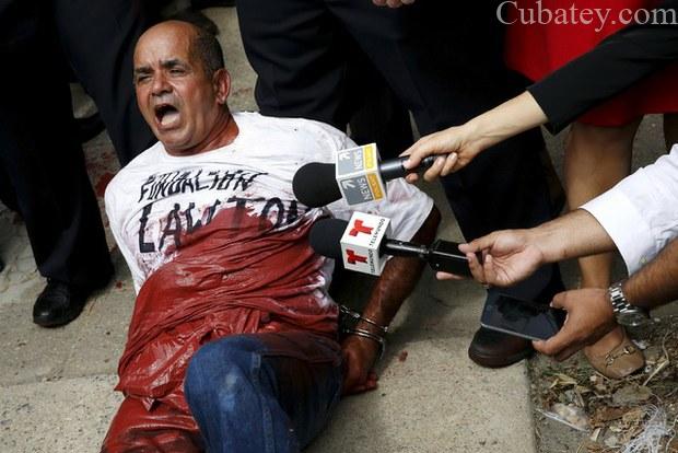 “Representa la sangre del pueblo cubano”, dijo en presencia de los periodistas el hombre, que se derramó pintura roja en señal de protesta contra el gobierno cubano. Inmediatamente fue identificado y esposado por miembros de la policía de Washington y del servicio secreto.